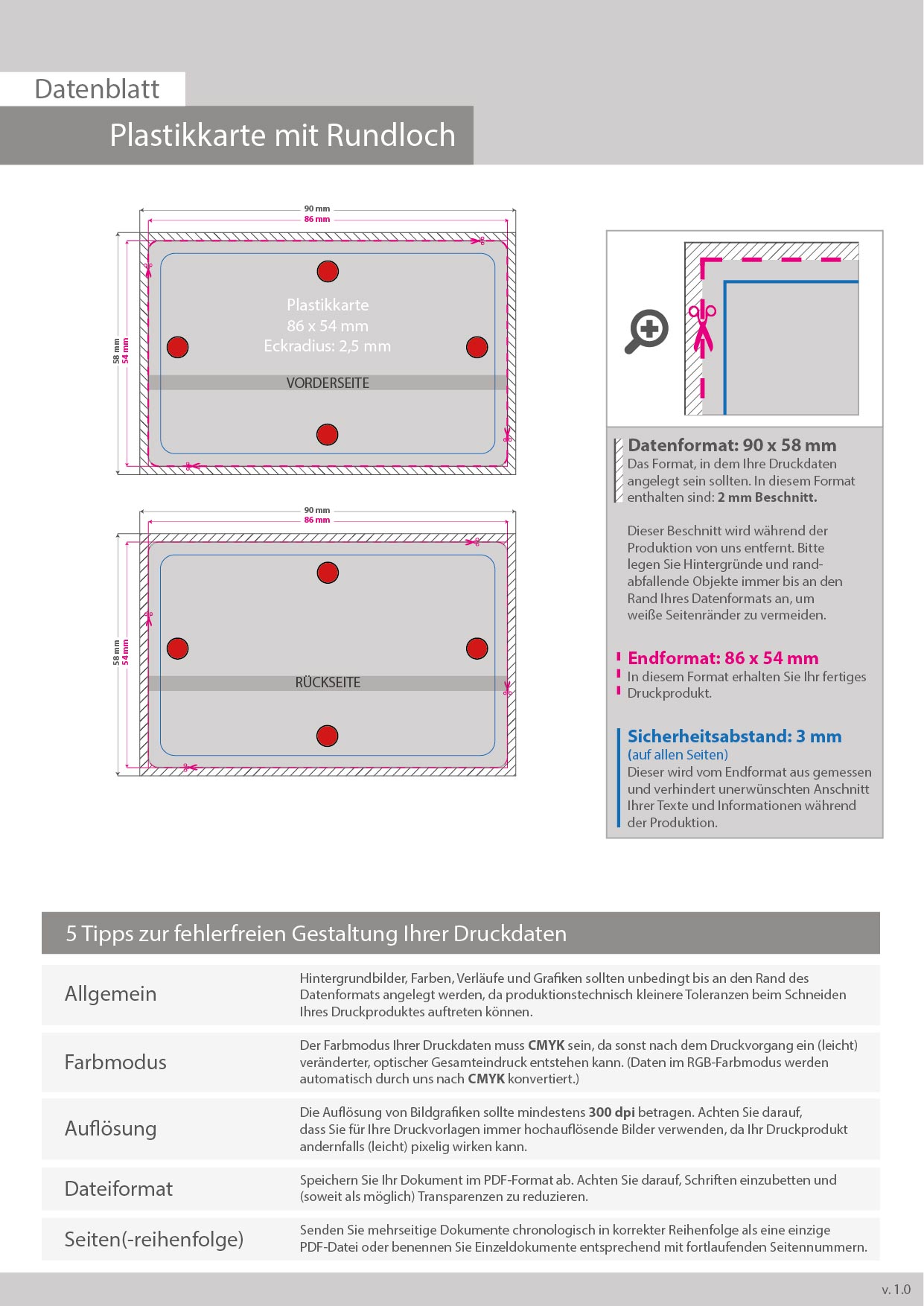 Plastikkarte mit beidseitigem partiellem UV-Lack und Lochung 4/4-farbig bedruckt auf weißem Hintergrund